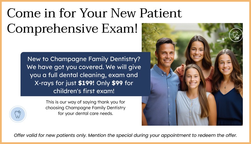 We’re excited to introduce a limited time special for new patients! Champagne Family Dentistry invites you to check out our current offer below. Want to learn more about our patient special or schedule an appointment with our dentists in Reno or Sparks? Visit our office today or call 775-391-3589 if you are a new patient. We look forward to welcoming you to the Champagne Family Dentistry family.